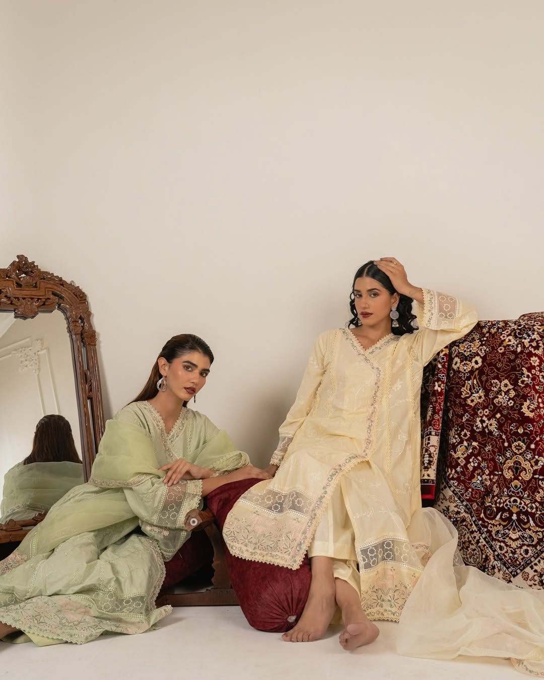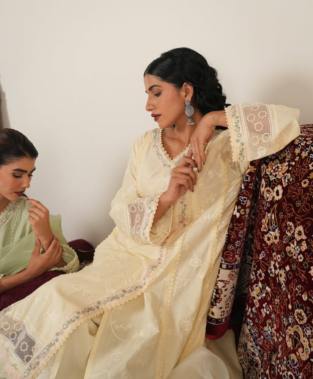 A cheerful butter yellow Angrakha-style Anarkali three-piece set in breathable lawn cotton. Embroidered accents, straight pants, and matching dupatta create a radiant seasonal ensemble.