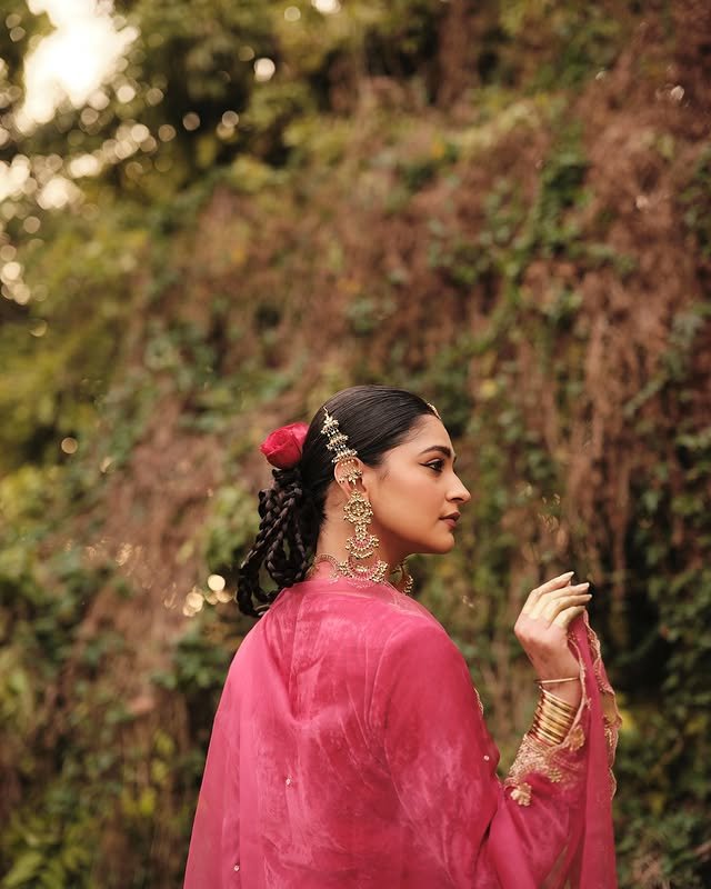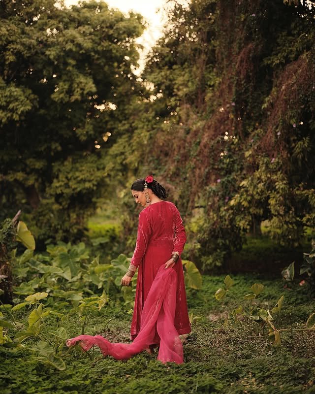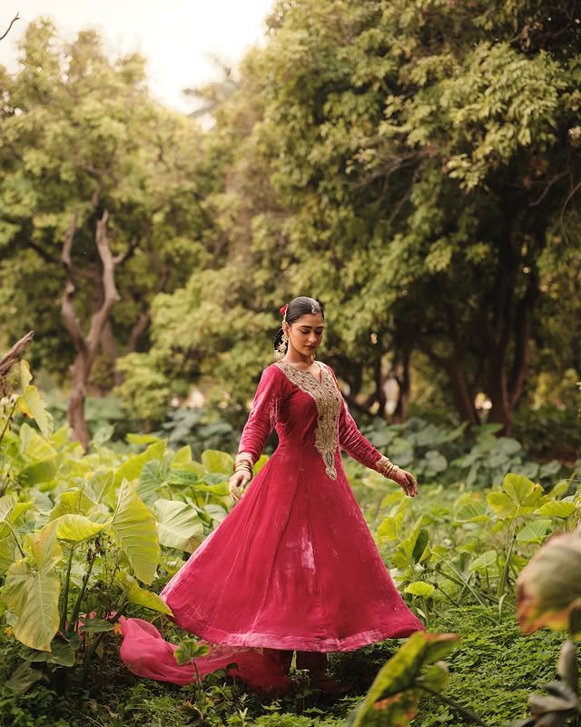 An elegant dark pink velvet Anarkali featuring delicate neckline embroidery. The bottom is crafted in rich khinkha fabric and paired with straight pants for a balanced traditional look.