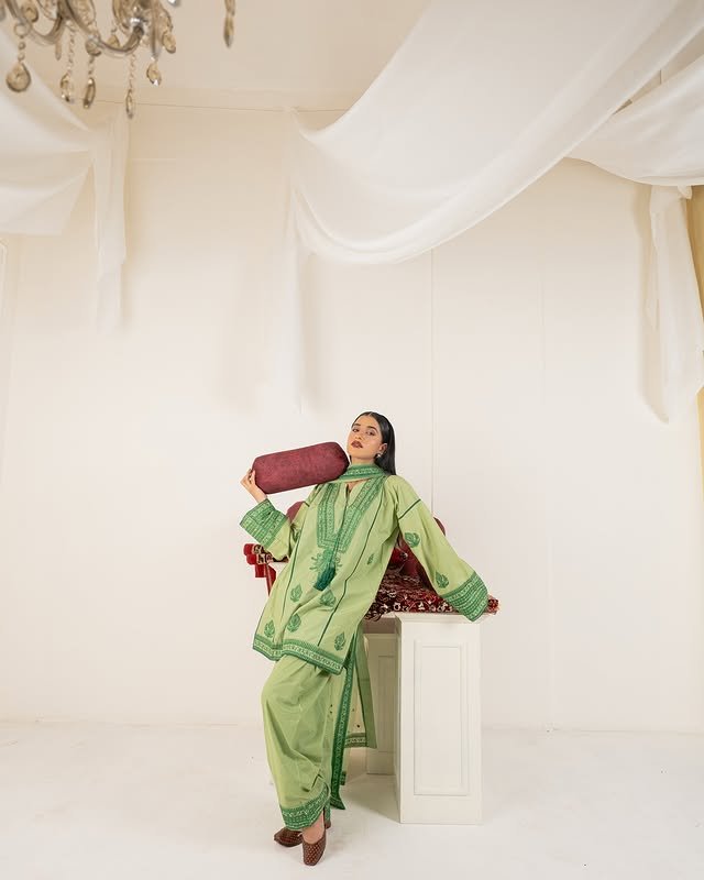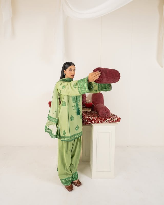 A refreshing green Farshi Salwar three-piece set crafted in breathable lawn cotton. Beautifully embroidered for an elegant yet lightweight summer look.