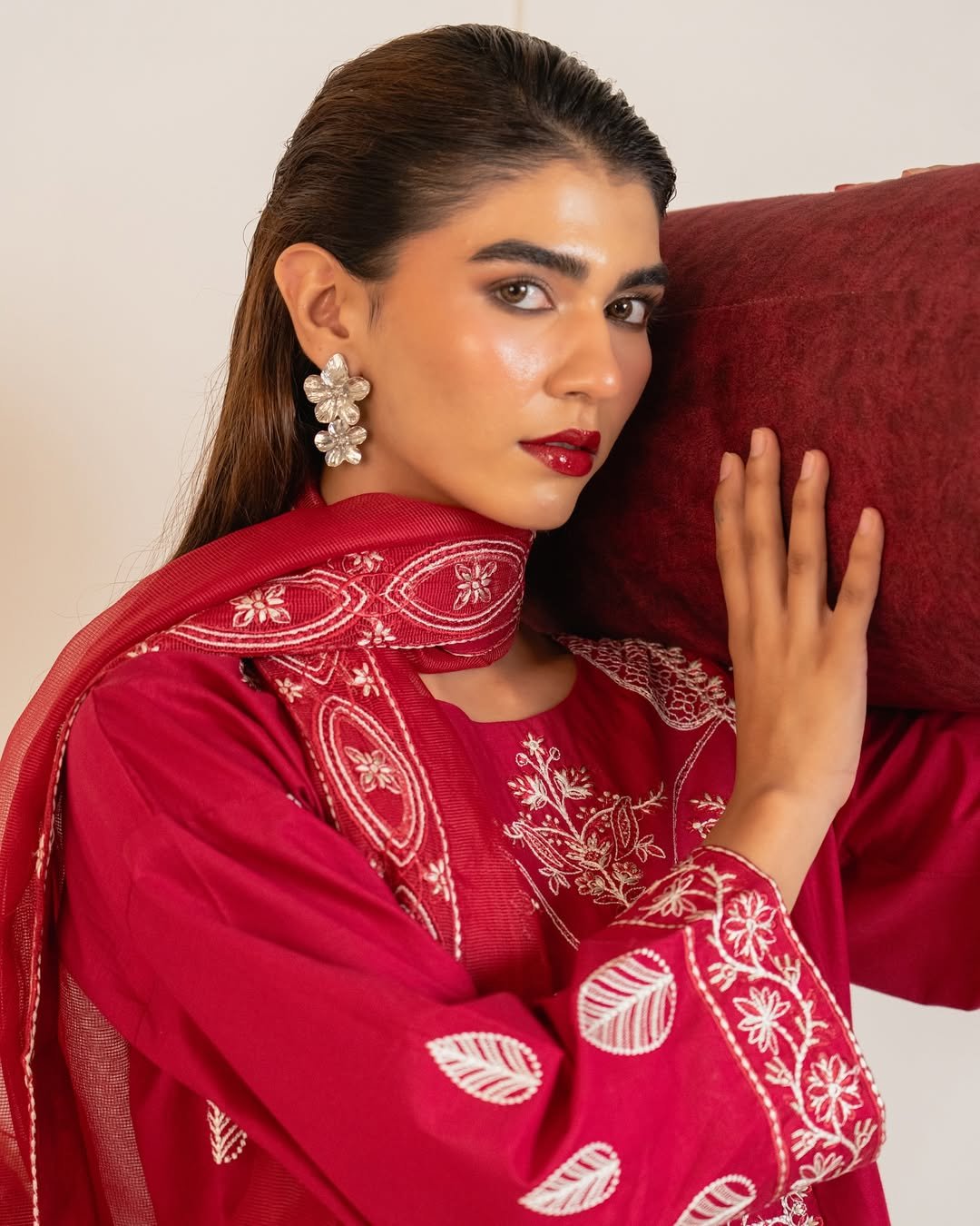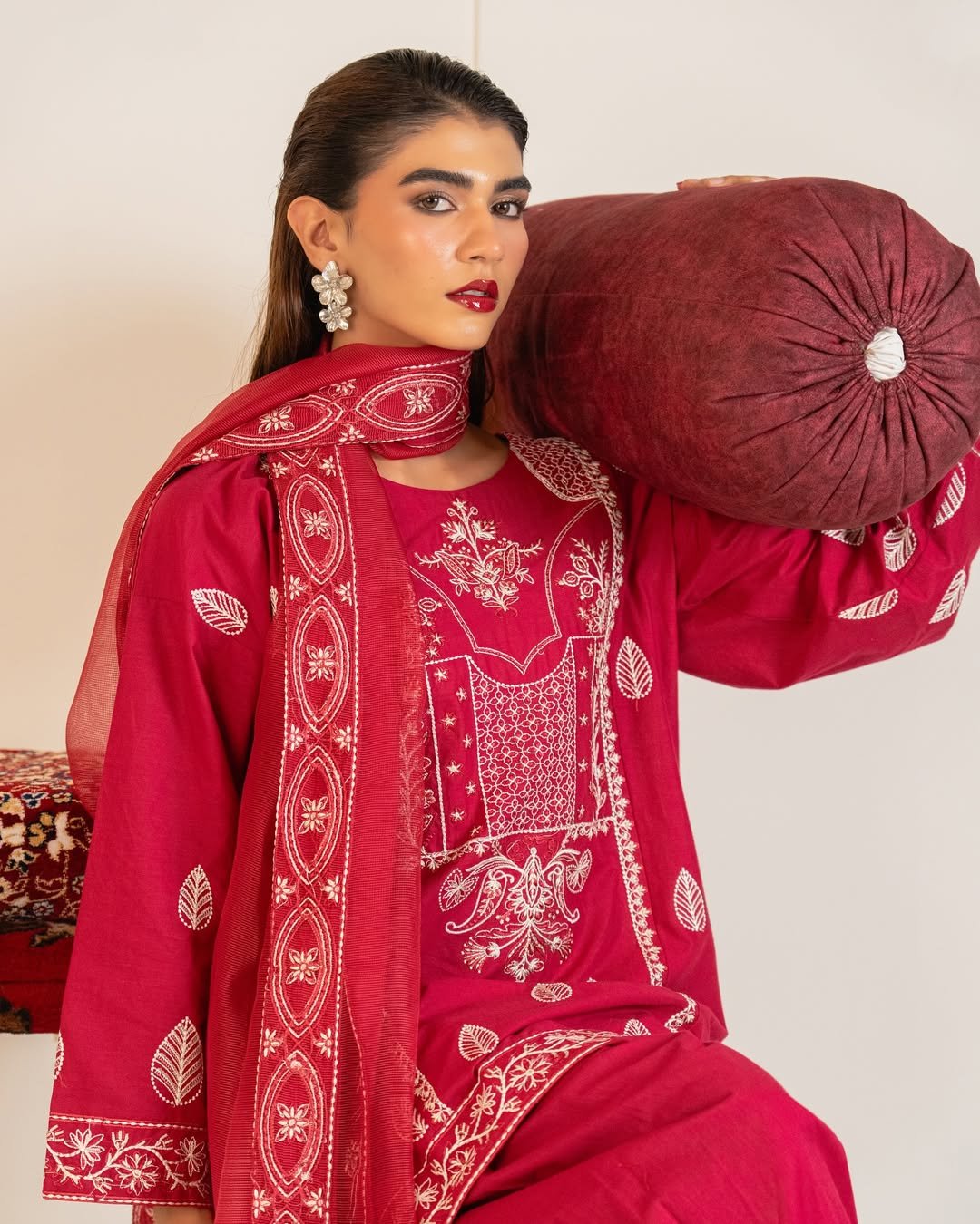A vibrant maroon Farshi Salwar three-piece set in cool lawn cotton. Embroidered detailing lends a touch of festive grace to this airy design.