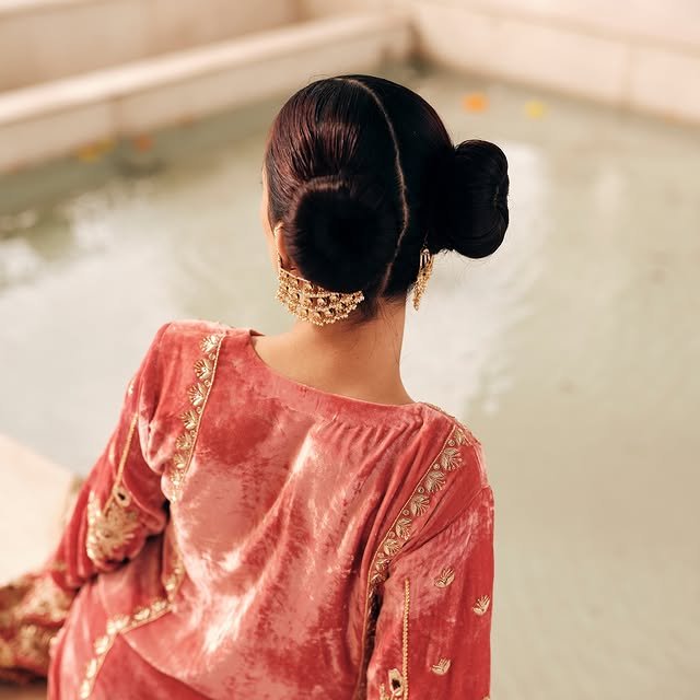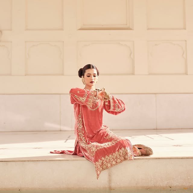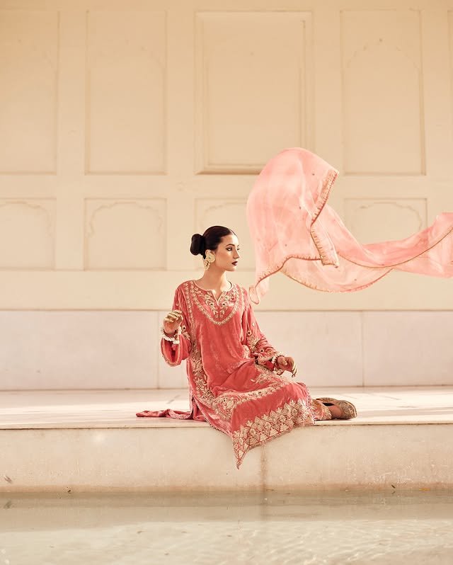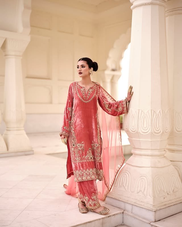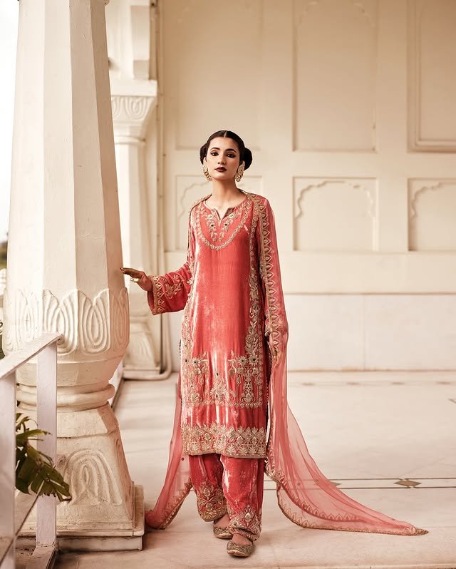 A luxurious peach velvet Pakistani salwar suit, intricately hand-embroidered with zardozi and zari work. Paired with a pure organza dupatta for an opulent finish.
