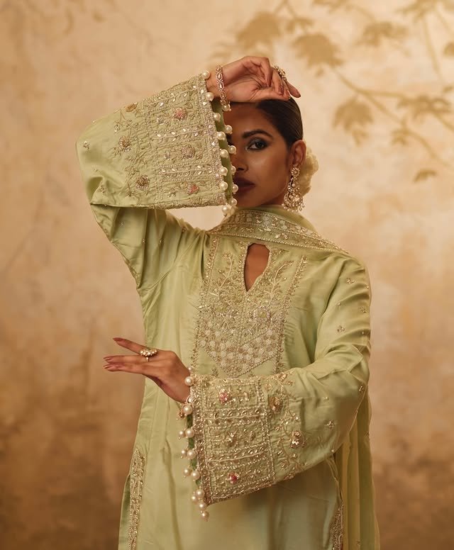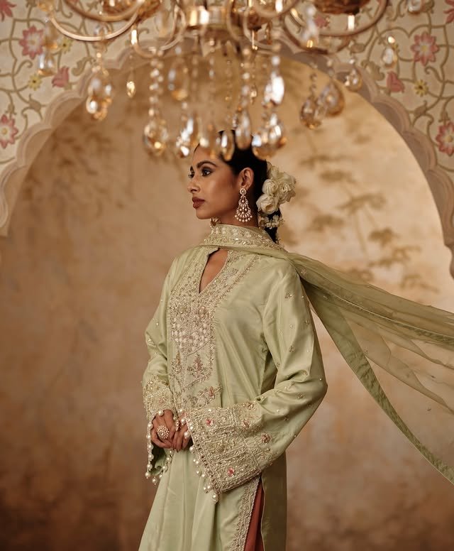 Pure silk elegance in a two-tone palette: a pistachio-green kurta paired with peach palazzo pants and a four-sided embroidered dupatta. Pakistani-inspired with Punjabi finesse, perfect for festive gatherings.